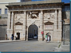 El acceso principal al casco antiguo se realiza por la Puerta de Tierra, del s.XVI, coronada por un león veneciano, que nos recuerda la relación de Zadar con Venecia. Junto a esta puerta se encuentra la Plaza de las Cinco Fuentes, lugar donde en el s.XIX los habitantes de Zadar se abastecían de agua mediante estas cinco pozos idénticos. En la misma plaza se encuentra la Casa del Capitán, dominada por su torre, y que actualmente alberga exposiciones.