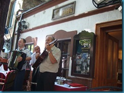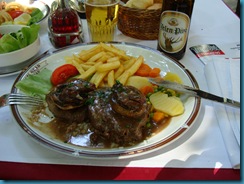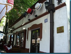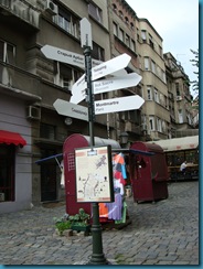Nosotros elegimos el restaurante «Tri šešira» (“Tres sombreros”). Donde, esta vez si, pudimos disfrutar de una deliciosa comida típica serbia. Muy recomendable el Tournedós (ver foto). Una vez terminado el estupendo almuerzo, recorrimos la calle hasta el final, donde tomamos un taxi para volver al Hotel a descansar de tanto paseo. Antes de ello pudimos admirar los otros preciosos restaurantes típicos de la calle con su bohemia decoración, así como comprobar como los vecinos de esta calle se vanaglorian de su carácter bohemio con una señal que en un cruce de caminos indica dónde y a qué distancia se encuentran otros barrios bohemios de Europa, en ciudades como Paris, Viena o Budapest.