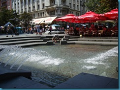 Llegamos después de atravesar varias calles y avenidas, y tras atravesar la imponente Plaza de la República, a la calle Knez Mihailova, donde paramos en una cafetería, al principio de la calle, junto a una hermosa fuente, para retomar fuerzas. Una deliciosa copa de frutas con nata. Recobradas las fuerzas, es el momento de conocer la ciudad.