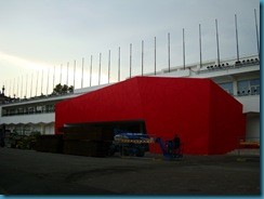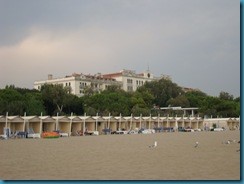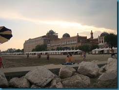 La playa del Lido tiene una longitud de 12 km. De arena fina, cada cierta distancia hay espigones, que dividen la playa en tramos. Los hoteles tienen instaladas elegantísimas casetas para sus clientes. Todo ello junto a las terrazas y bares con césped junto al mar, como la del mítico Hotel Des Bains, le dan un aire de tremendo glamour. Guarda el aspecto señorial de las playas de principios del s.XX. Nos viene a la mente la imagen de la película “Muerte en Venecia” de Visconti, y es que el Lido está muy unido al cine. El Palacio del Cinema se estaba preparando para el gran certamen de la Mostra de Venecia.
