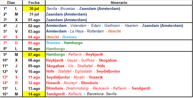 El resumen de las etapas de nuestro viaje es el siguiente: