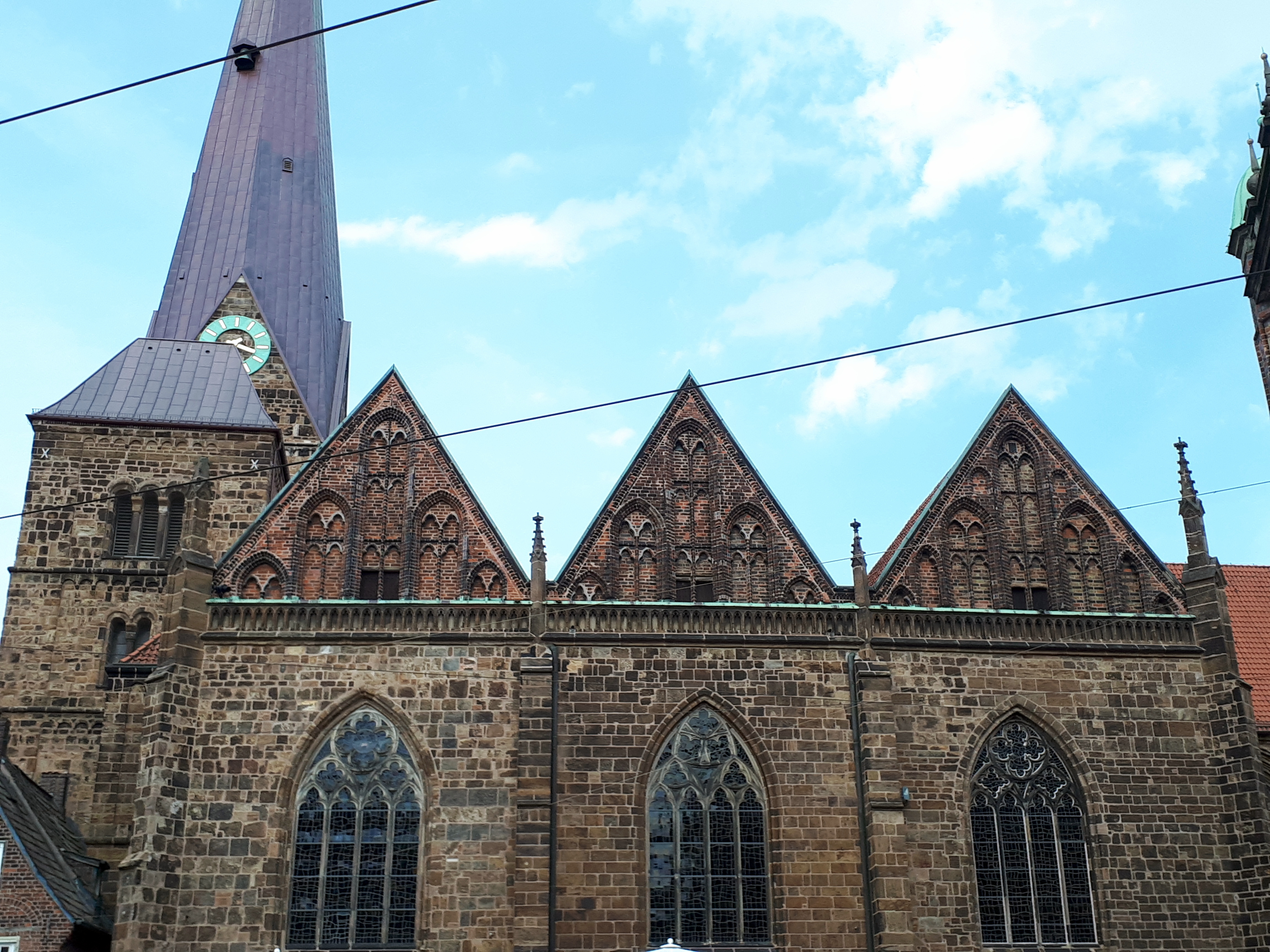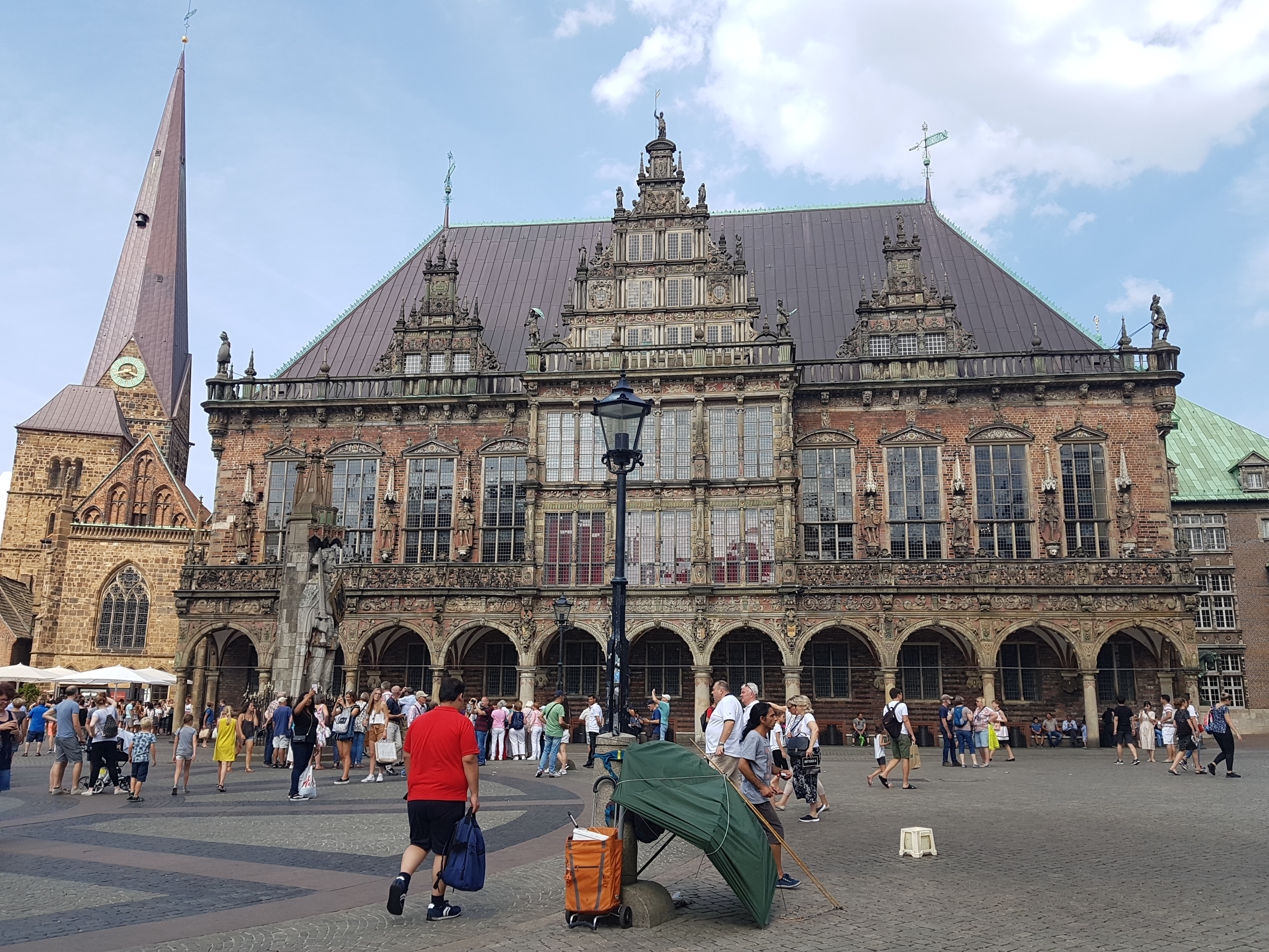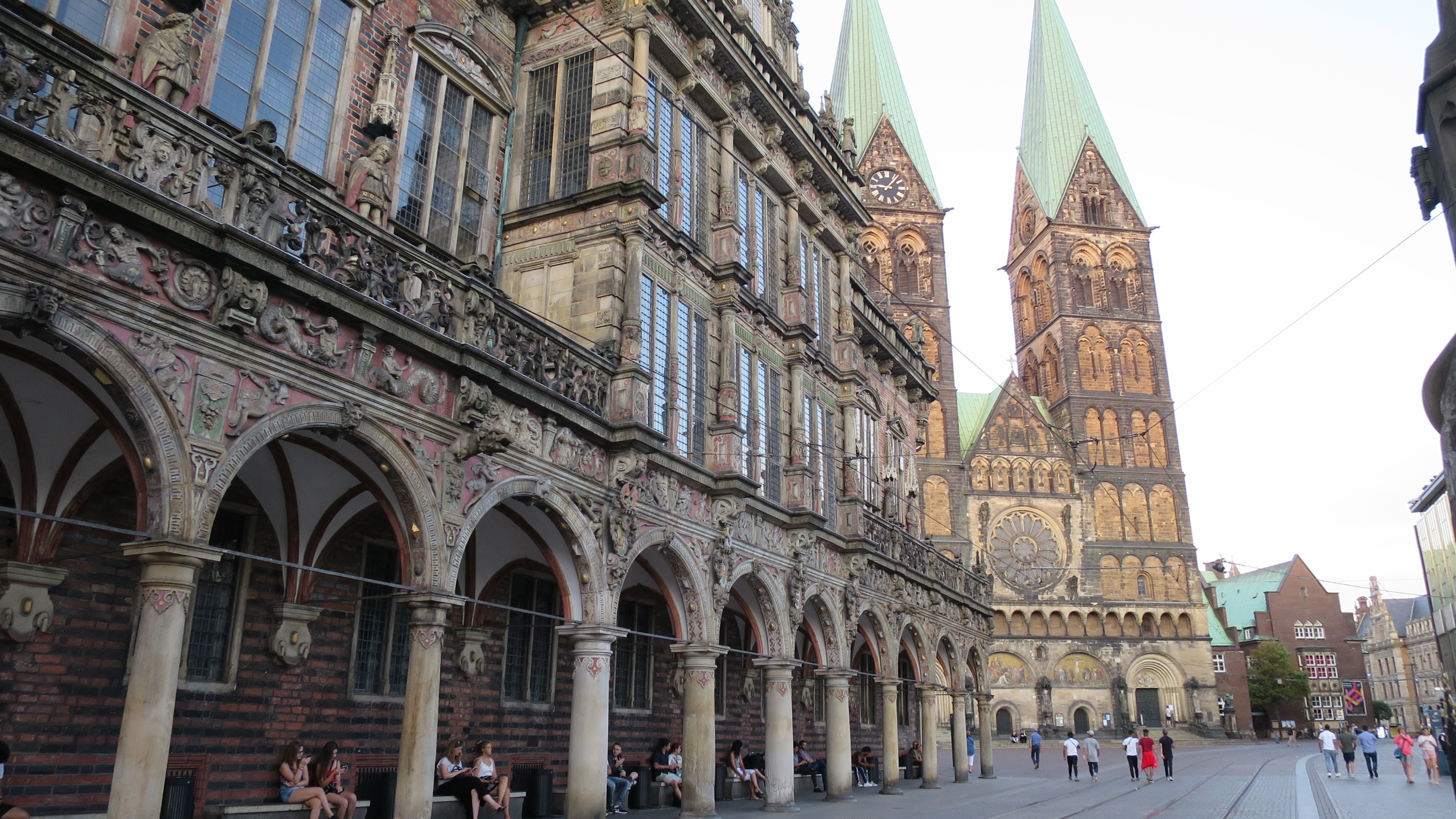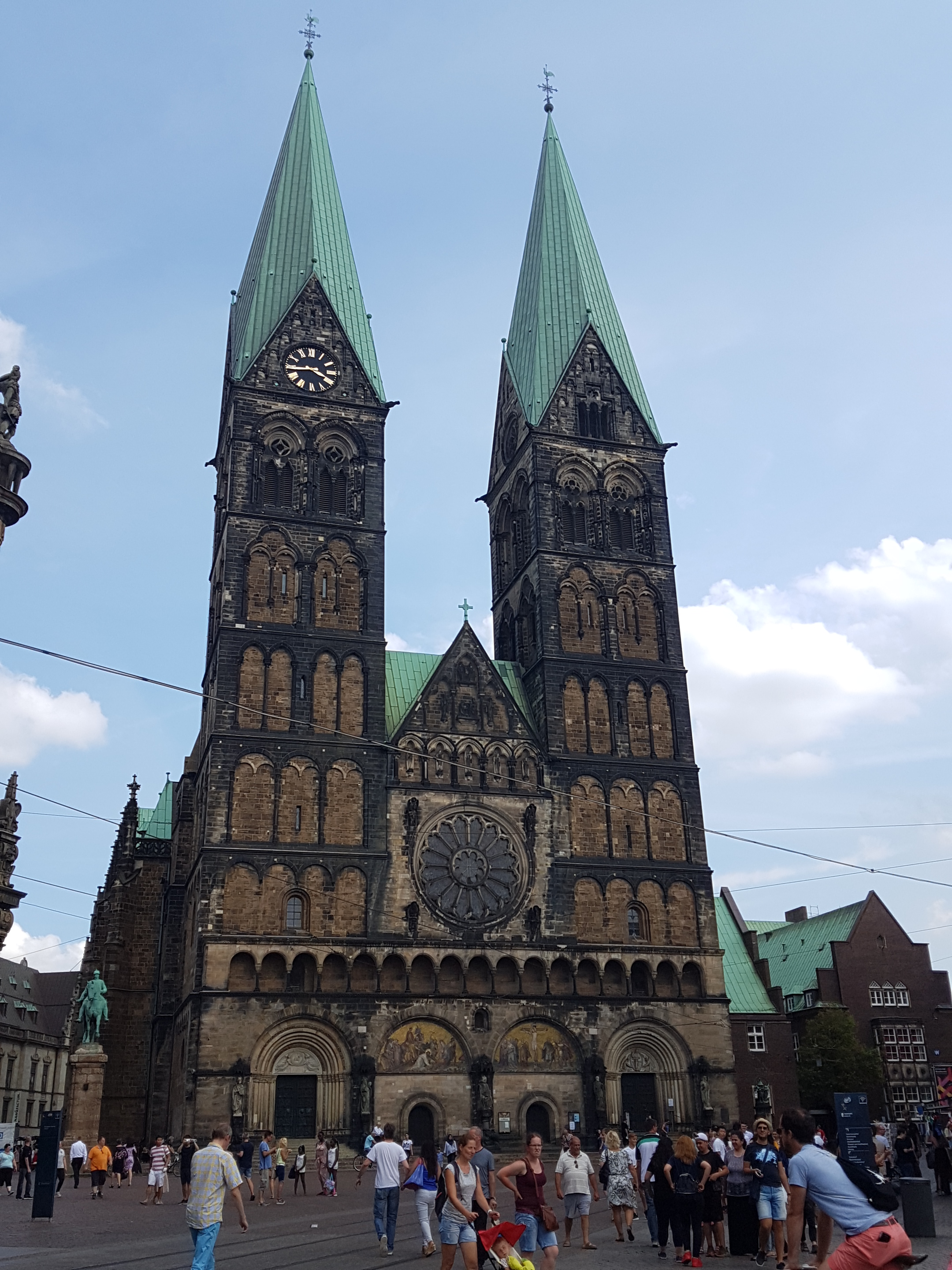 Regresamos, por tanto, a través de la calle Sandstrasse y la plaza Domshof, en el lateral del Ayuntamiento hasta la Marktplatz. En esta ultima plaza se puede ver la monumentalidad de la Catedral de San Pedro y frente a ella la mole cudrangular que representa el Bremer Landesbank, unos de los bancos más importantes de esta región.