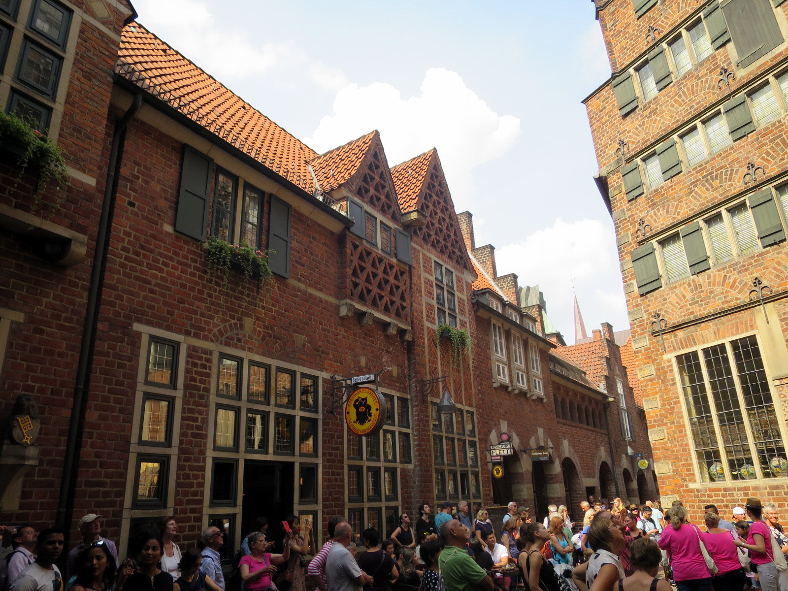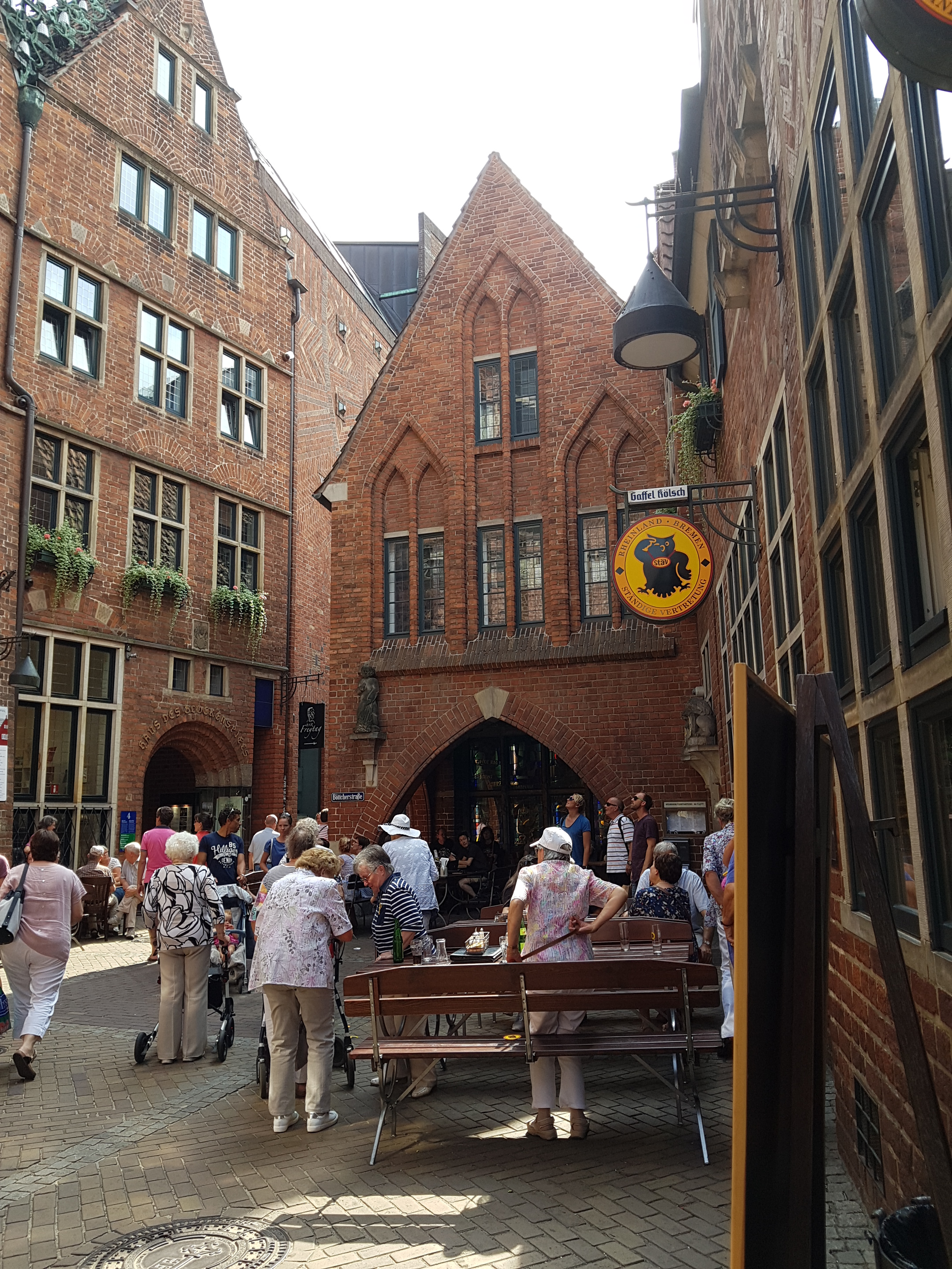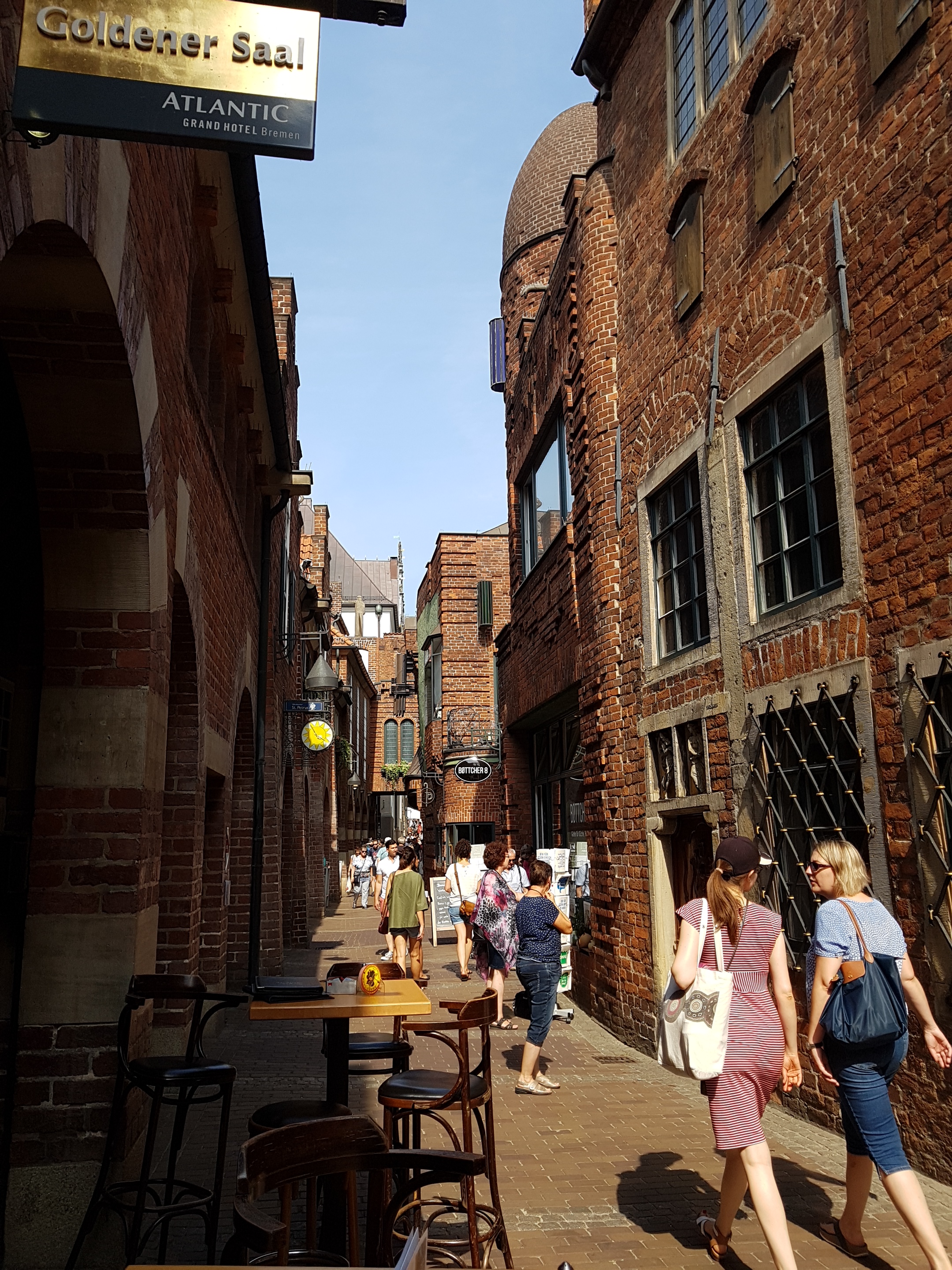 Caminando a la derecha de la Casa de la Ciudadanía llegamos a la calle Böttcherstrasse, la antigua calle de los antiguos toneleros que enlaza la Marktplatz con el río Wesser. Se reconstruyó esta calle en los años 20 por iniciativa del comerciante cafetero Ludwig Roselius. Llaman poderosamente la atención sus edificios de ladrillos rojos que no atienden a ningún estilo arquitectónico en concreto. En la actualidad en una zona peatonal repleta de tiendas.