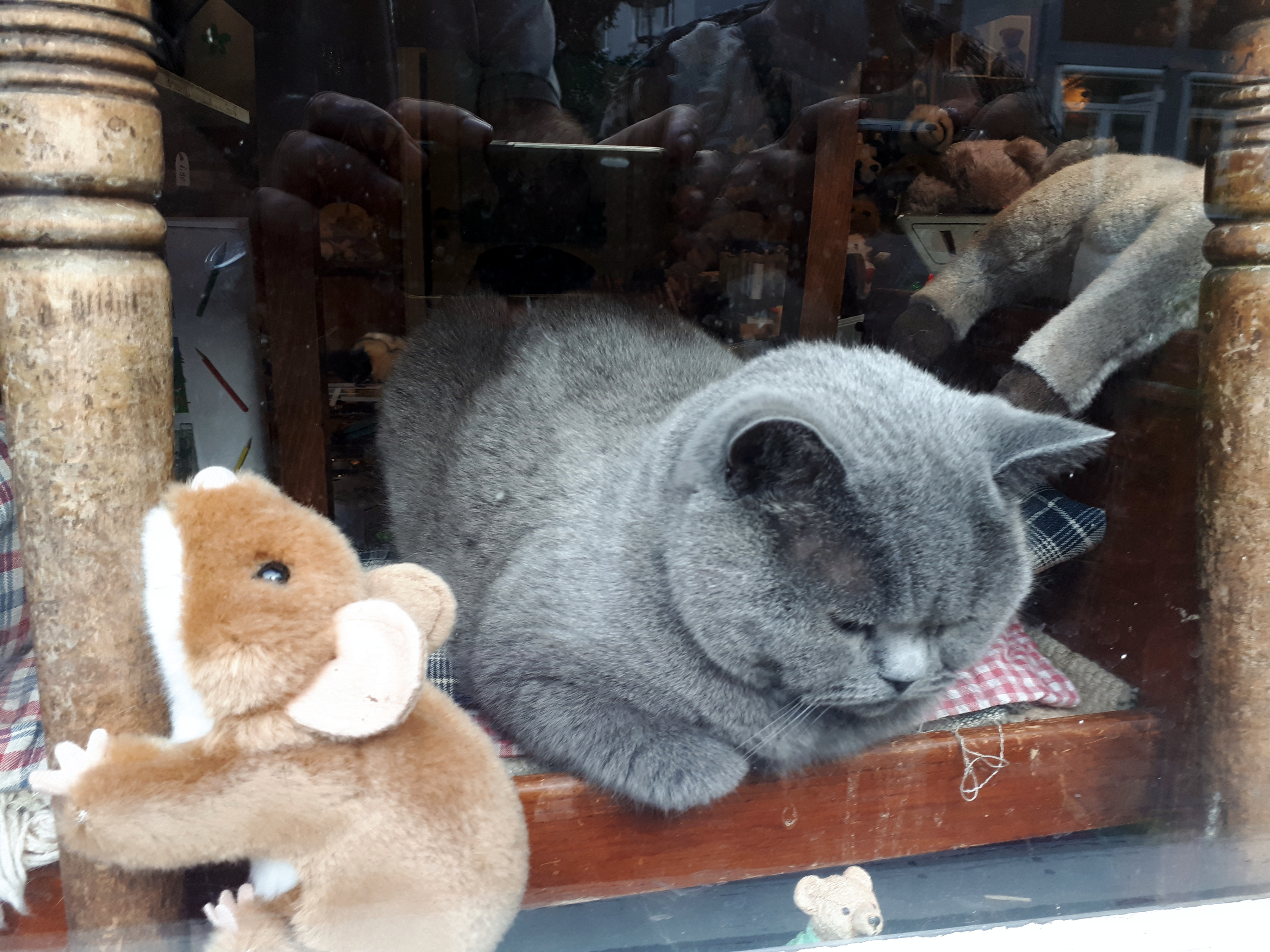 La sorpresita, no es otra cosa que un lindo gatito gris que había en el escaparate, inmóvil, pero que no era un peluche sino un gato de verdad. Para comérselo.