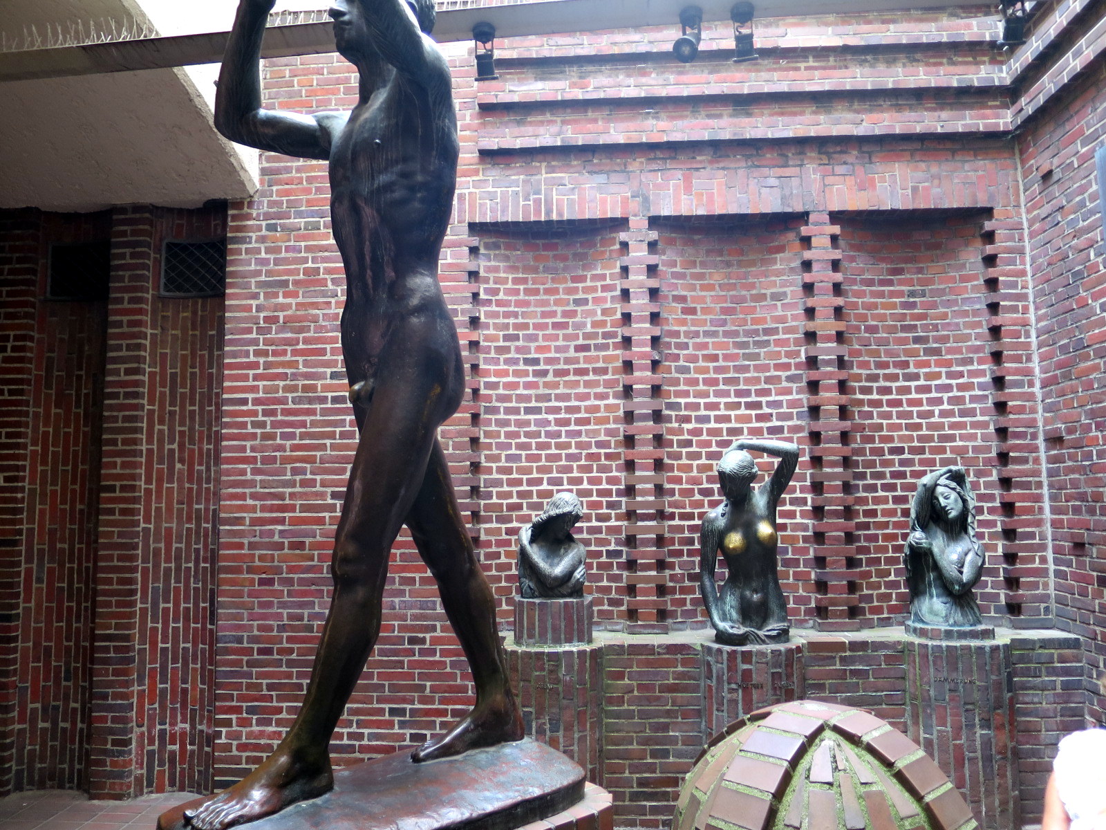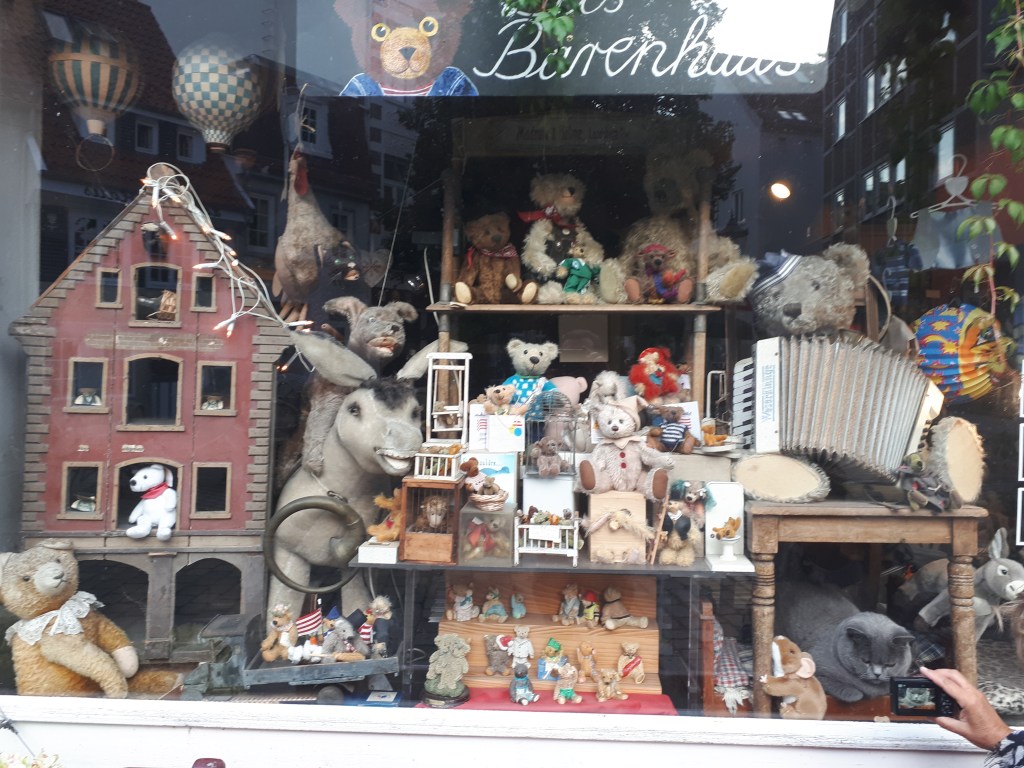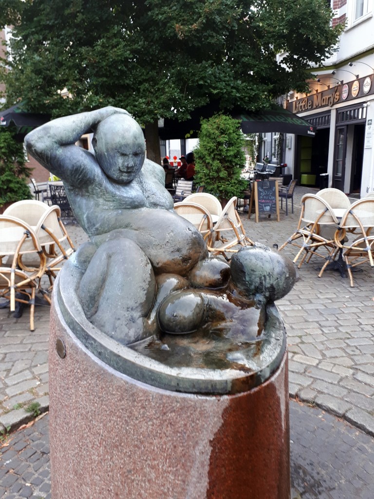 Todas las calles son preciosas y detrás de cada esquina te espera alguna sorpresa. Por ejemplo la bella plaza Stavendamm, llena de encanto, con una extraña escultura en el centro que representa unos gordos bañándose o retozando dentro de un estrecho barril. También había una preciosa tienda de muñecos con una sorpresita adorable en su escaparate.