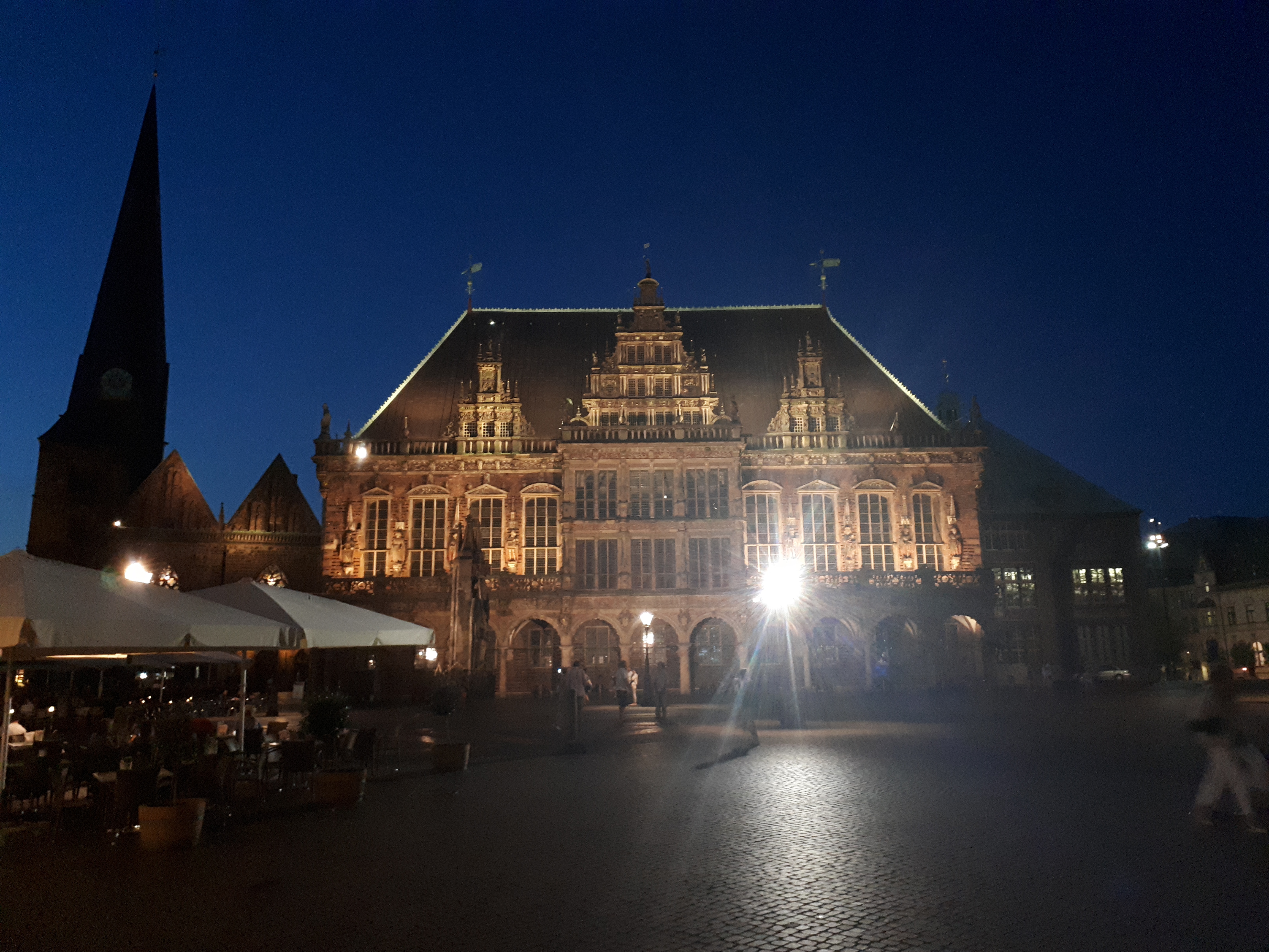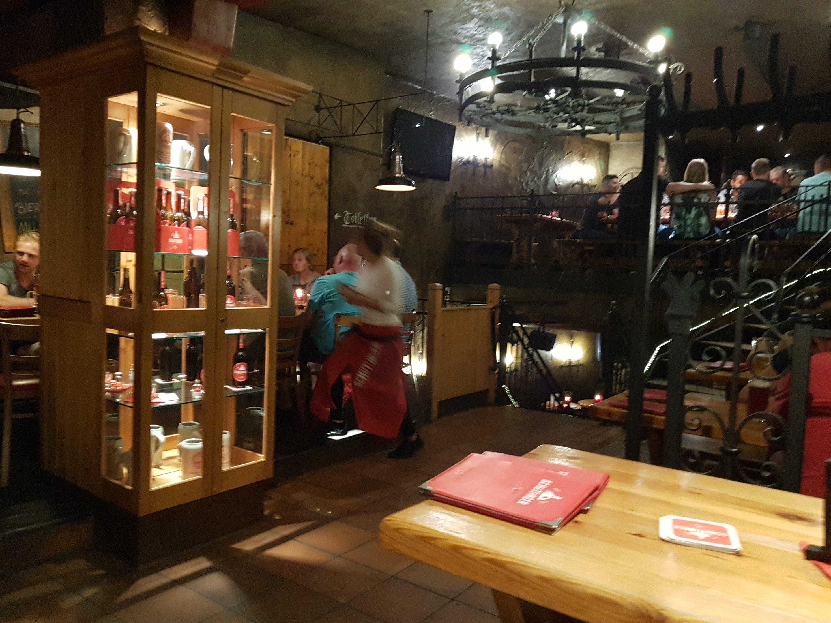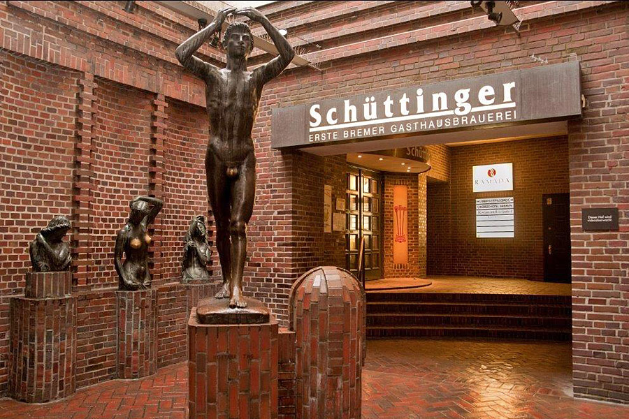 En ese momento, ya cayó la noche sobre Bremen, y era el momento de buscar un sitio para cenar. Para ello no pudimos escoger mejor sitio que la Cervecería Schüttinger Gasthausbrauerei. Esta cervecería se encuentra en un callejón de la Böttscherstrasse. En ella fabrican su propia cerveza y se puede disfrutar de la típica gastronomía alemana. Es un local enorme y con un muy agradable ambiente, genuínamente alemán.
