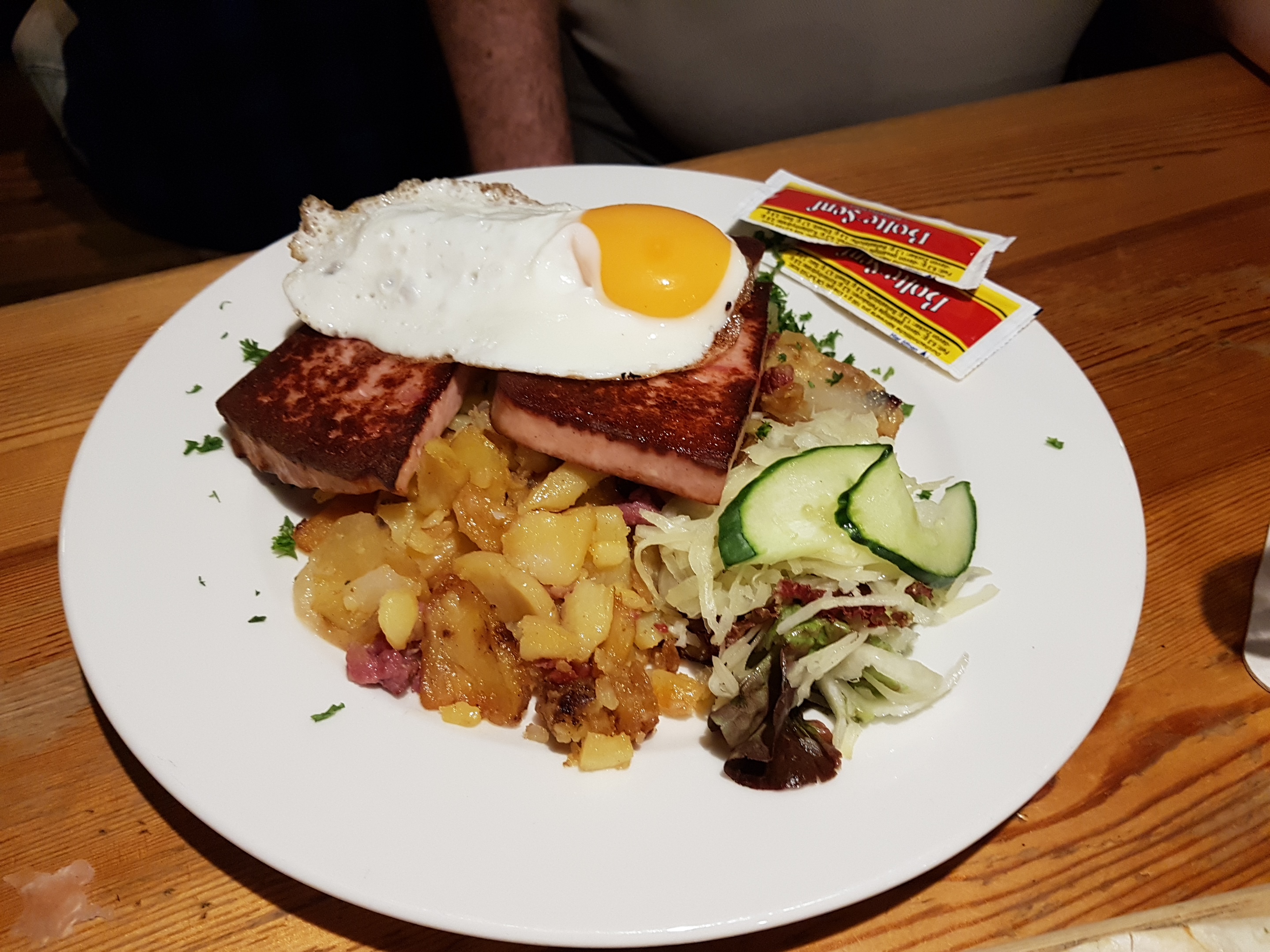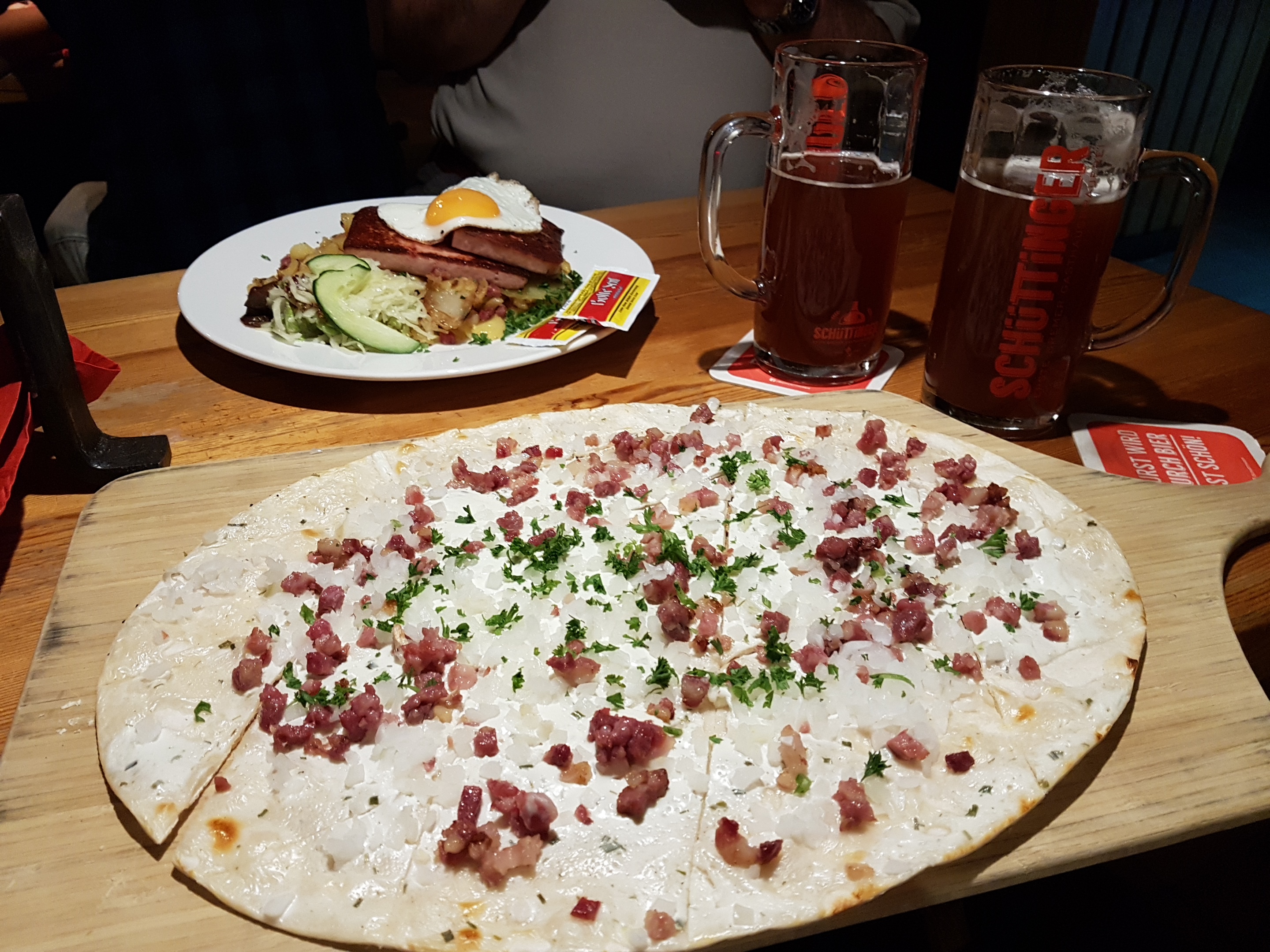 Esta noche cenamos una especie de pizza alemana que aquí llaman Flammkuchen y un plato de Leberkäse con huevo frito patatas y verduras. Esto es una especie de embutido alemán una textura de pasta de carne que ponen asada y que a mi particularmente me encanta. Todo regado, por supuesto con unas magnificas jarras de la cerveza local.