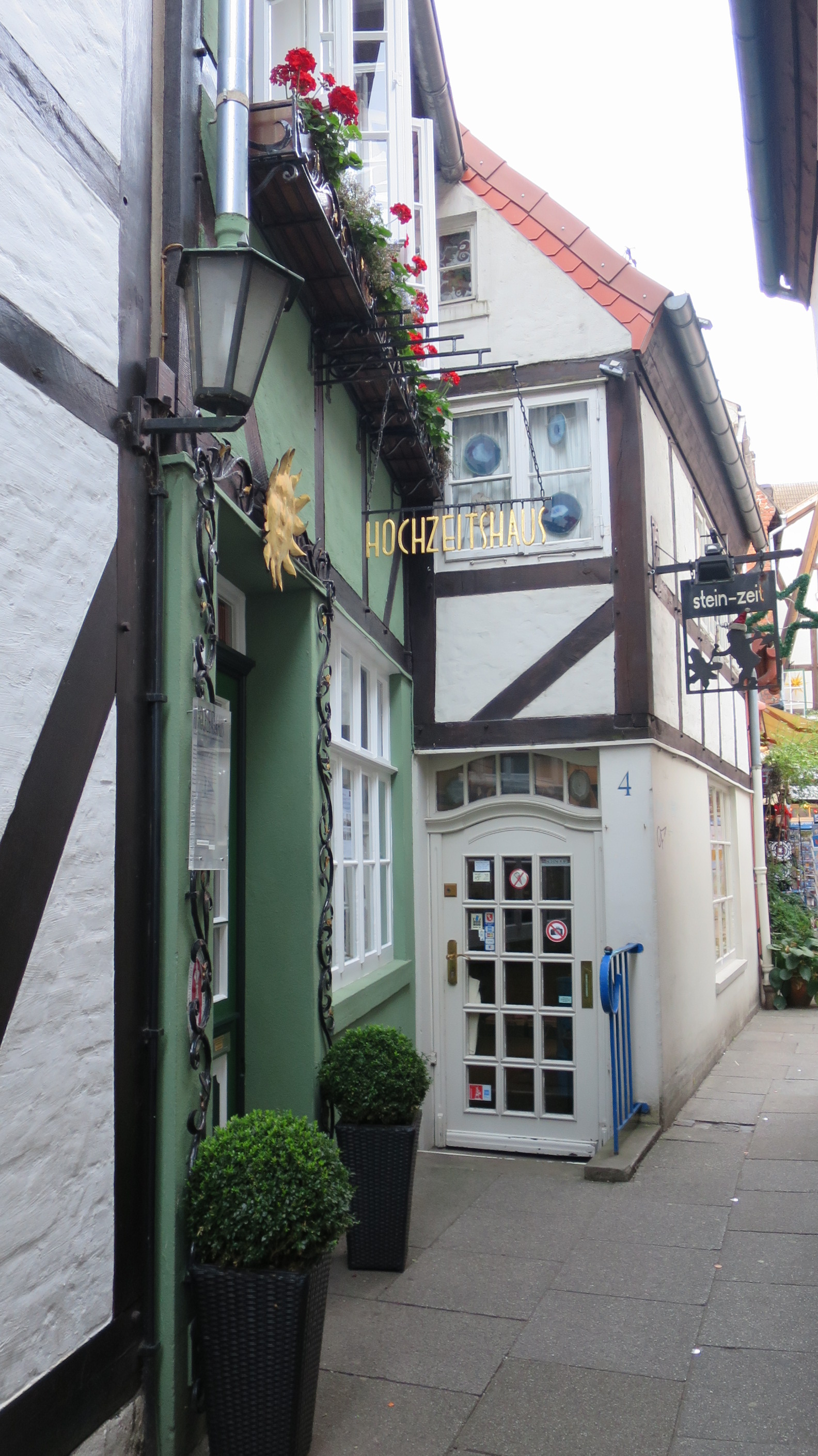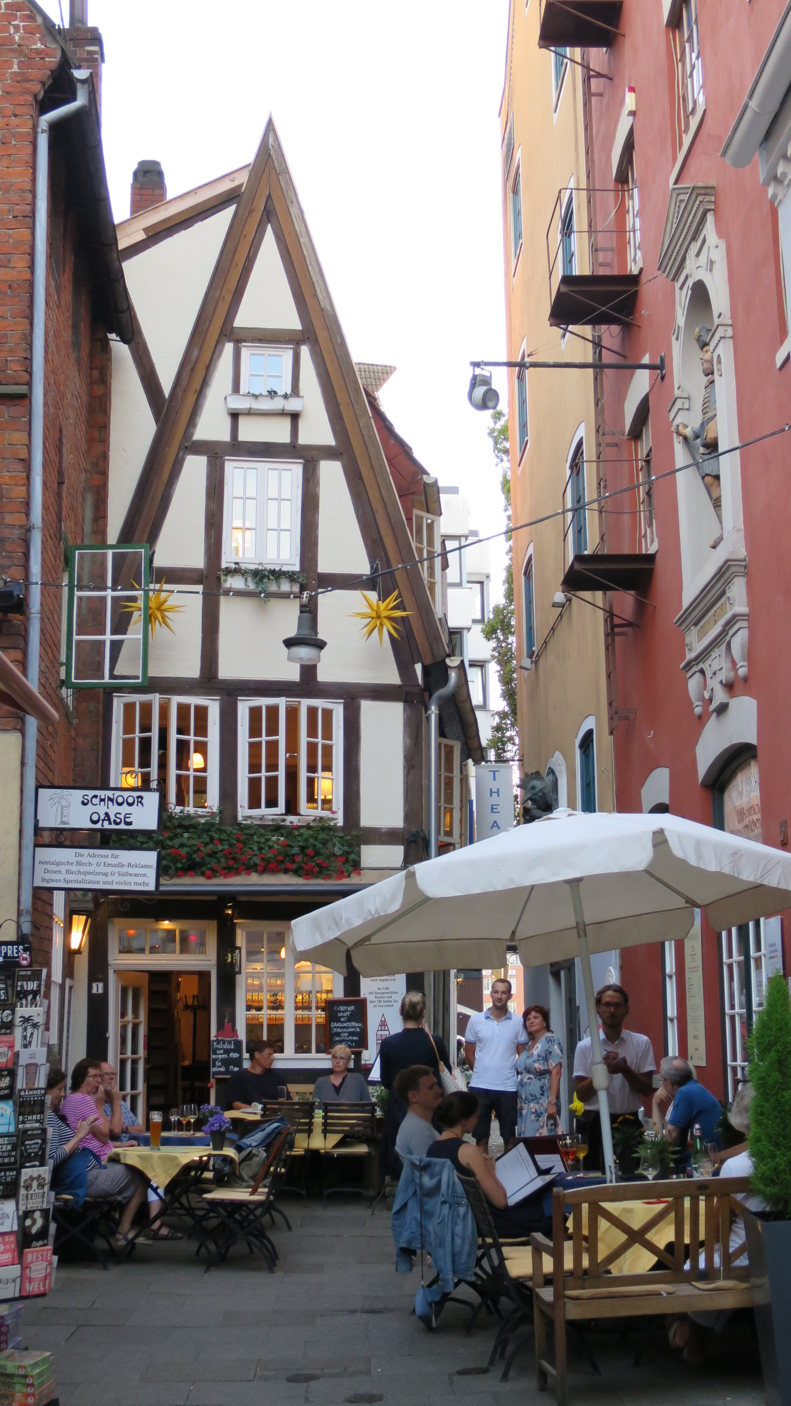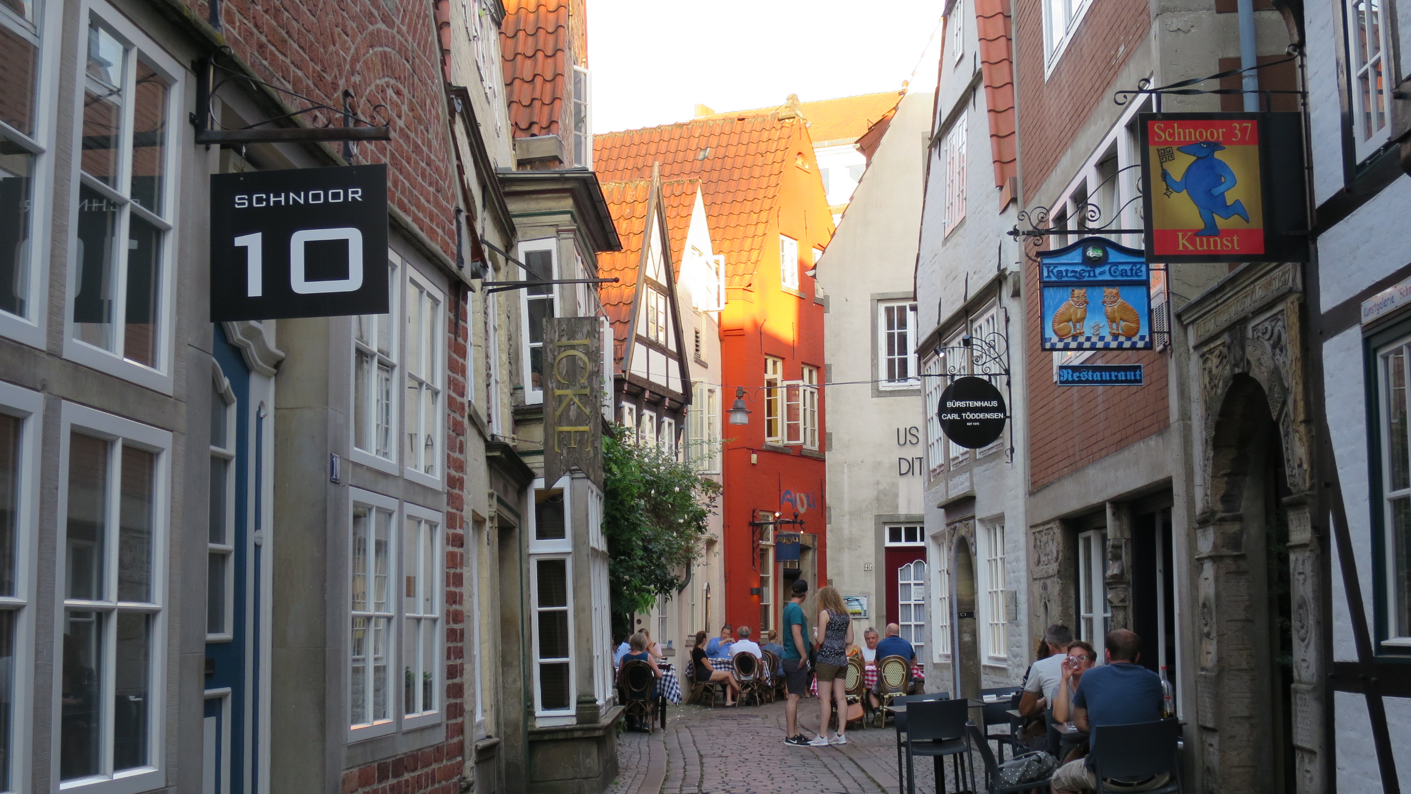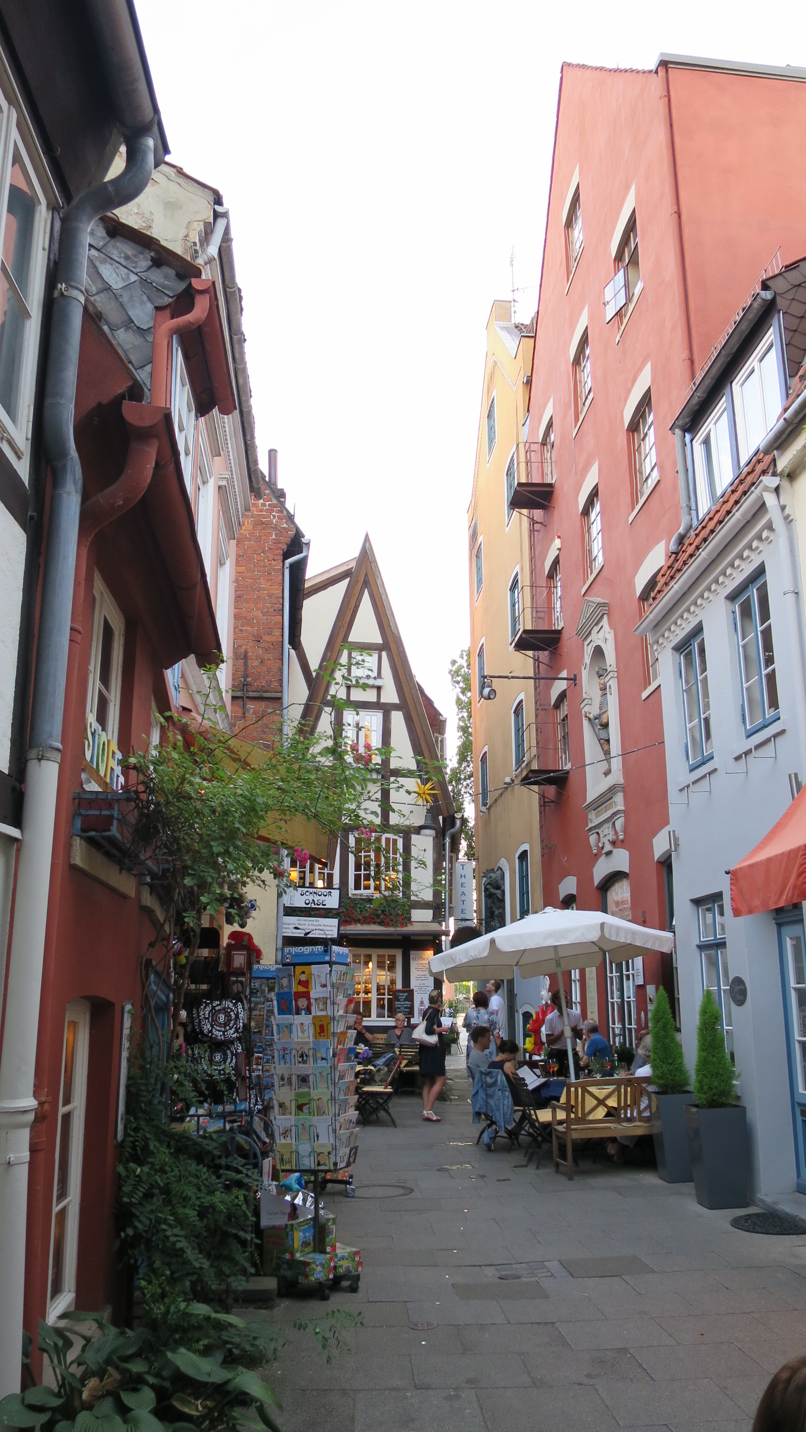 Después de descansar un buen rato en la Ribera del río Wesser nos encaminamos al precioso barrio de Schnoor. Es un barrio hanseático con estrechas calles con casas de colores de los siglos XV y XVI. Es el barrio más antiguo y bohemio de Bremen y en el conviven multitud de comerciantes y artistas. Es un verdadero placer perderse por su laberinto de callejuelas lleno de curiosas tiendas, plazas y restaurantes.