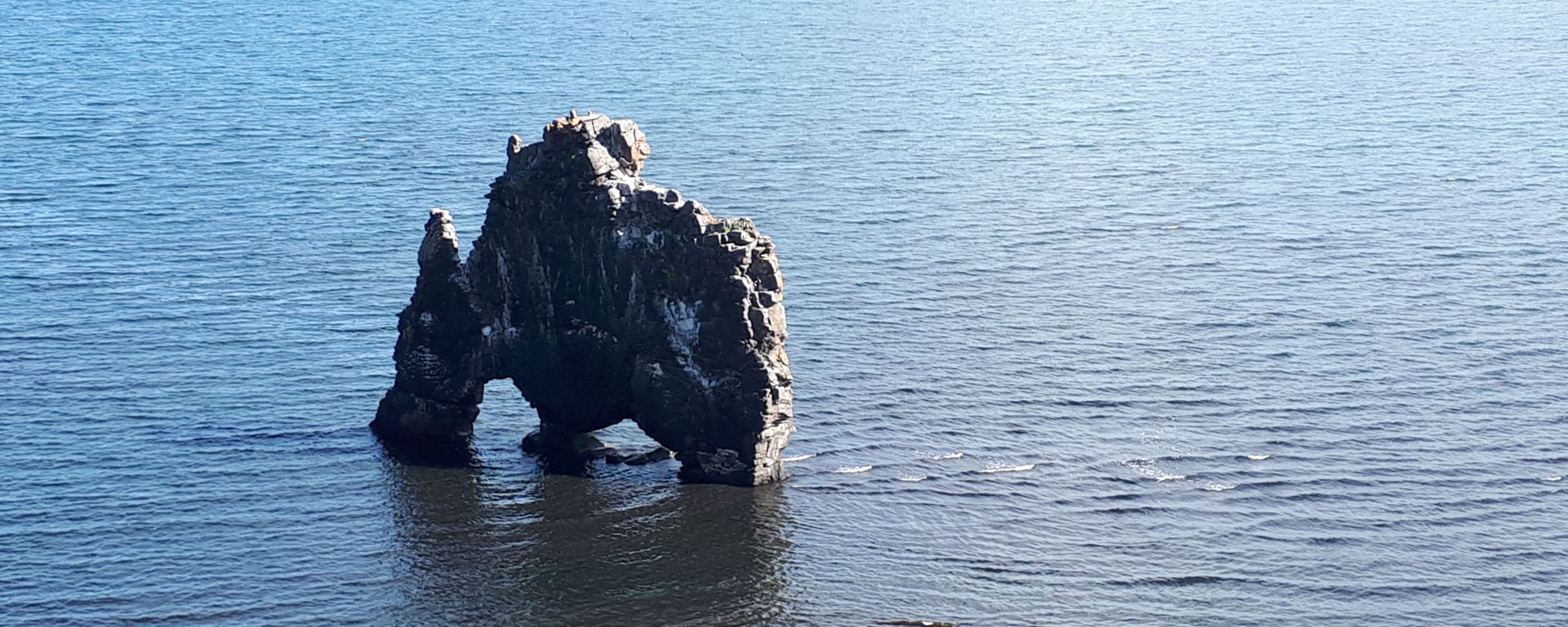 La primera parada fue en Hvítserkur. Allí encontramos un parking donde dejamos el coche y a continuación seguimos un sendero que nos lleva un mirador sobre el acantilado desde el que se ve una curiosa formación rocosa. La leyenda cuenta que se trata de un troll que quedó petrificado por el amanecer al intentar destruir el monasterio de Thingeyrar. Otra gente dice que parece un rinoceronte.