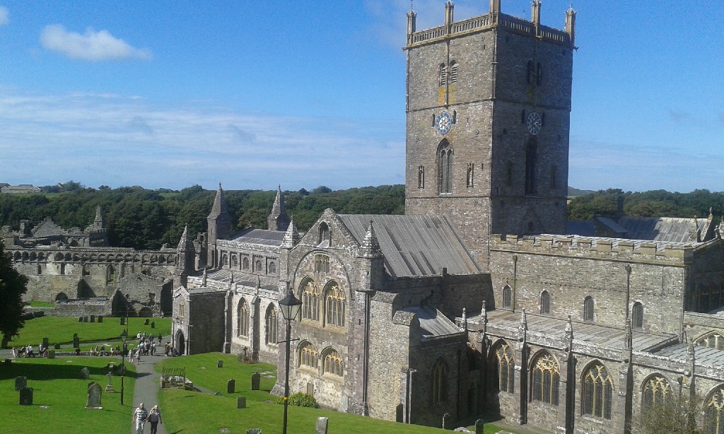 La actual Catedral de San David, se comenzó a construir en 1181, sobre las ruinas del monasterio que San David fundó en el siglo VI. El edificio sufrió varios saqueos y algun terremoto que dañó sus estructura. Posteriormente fue dañada por las torpas de Cronwell, en la guerra civil.